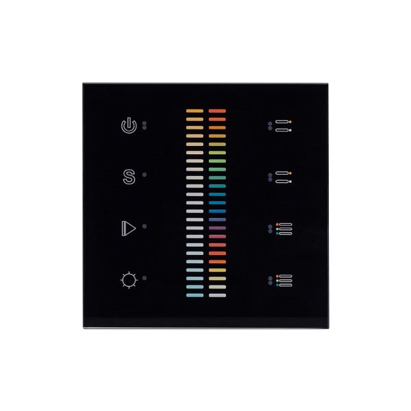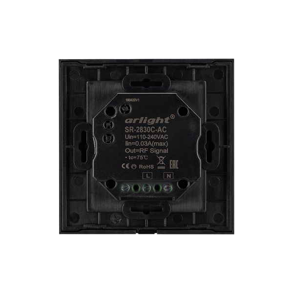Встраиваемая стеклянная черная Touch-панель с сенсорным слайдером, 4 зоны, 1-2 зона CCT, 3-4 зоны RGB. Управление – по радиоканалу (совместимы с контроллерами SR-1009x). Питание 220 В. Размер 86x86x29мм.