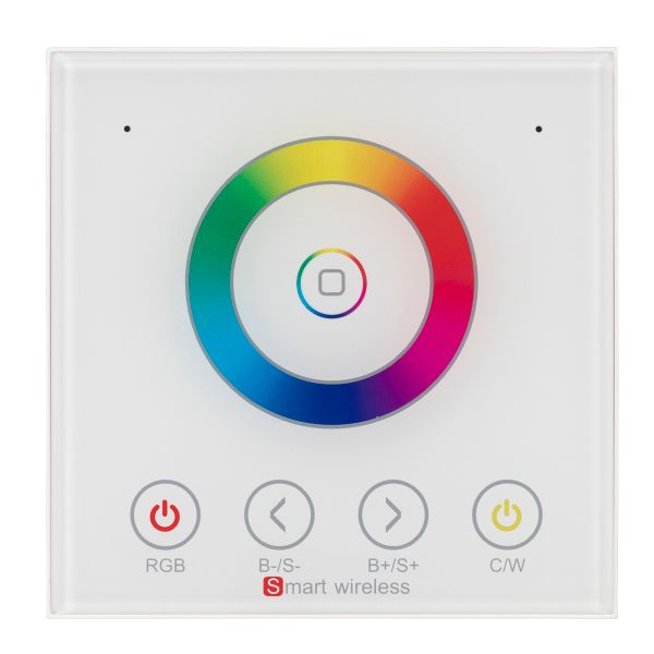 Встраиваемая сенсорная панель (Европейский стандарт) для управления RGBW светодиодными лентами, цвет белый. 4 канала, питание DC 12-24V, ток нагрузки 4x4A, мощность нагрузки 192-384W. Габариты 89х89х40 мм.